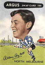 In 1954, Argus Newspaper released the VFL Football Caricature Swap Card Series, featuring photos of players heads with cartoon drawn bodies and background. They were very popular at the time and inspired the 1957 Kornies Mascot set too. There were 144 cards in the set, which was a large number for the era. 12 players from each VFL team were featured, including the rookie cards of North Melbourne legend Allen Aylett and Melbourne star John Beckwith.
