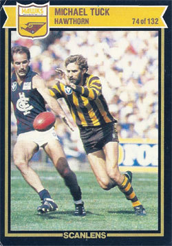 The 1987 Scanlens VFL set was the final set Scanlens produced on their own (they teamed up with Stimorol for the next few years). Similar to previous years, the set featured 132 cards, 10 players from each of the 12 teams and a checklist for each. Probably the most prized card in the set is the Jason Dunstall rookie card, the first ever card of the legendary Hawthorn spearhead. Dunstall kicked a massive 1254 goals during his career, second only to Tony “Plugger” Lockett.